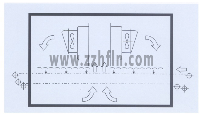 冷風(fēng)機(jī)出來的冷風(fēng),從擋風(fēng)板排列的縫隙均勻噴出,使產(chǎn)品重復(fù)受到強(qiáng)弱不間的冷風(fēng)豎吹而冷凍,即“熱波動(dòng)冷凍方式。由于該方式所需風(fēng)量較小,因此可達(dá)到節(jié)能目的。
