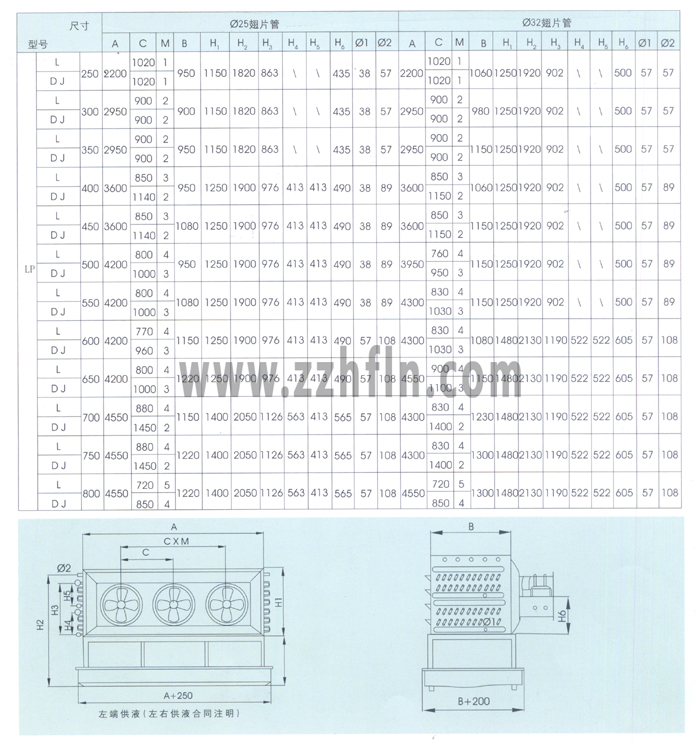GTLØ25管落地頂吹式、上側(cè)吹式冷風(fēng)機(jī)尺寸表