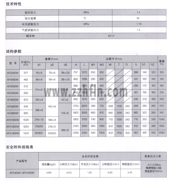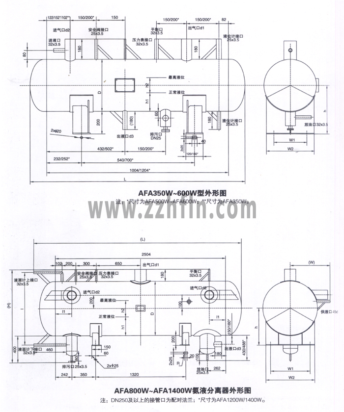 AFA-W系列氨液分離器為臥式結(jié)構(gòu),來(lái)自蒸發(fā)器的氨氣從設(shè)備一端或兩端的進(jìn)氣管進(jìn)入,分離液滴后從設(shè)備的另一端或中間的出氣管被壓縮機(jī)吸走。